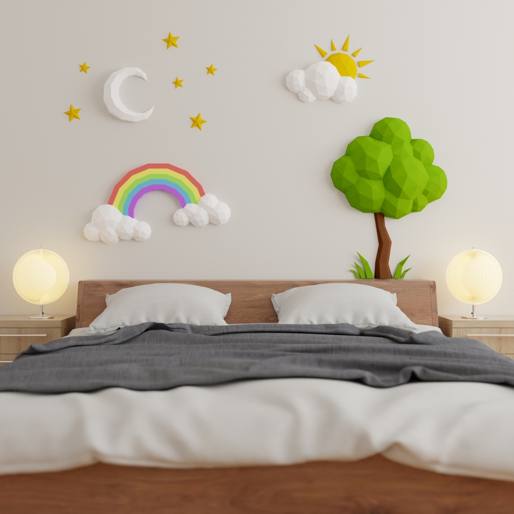 Perfect for nursery, small child and kid's room, this set of 4 different paper models will bring even more life to an empty place on the wall.